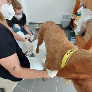 Wie es der Zufall so wollte, sah Dr. Nathaniel in einer Fachzeitschrift einen Bericht über Orthesen, die aus der Humanmedizin seit geraumer Zeit auch Hunden angepasst werden. Gestern war es so weit, Yoga wurde ein Gipsabdruck gemacht und bereits in ein paar Tagen kann die individuell auf Yogas Bedürfnisse abgestimmte Orthese abgeholt werden…